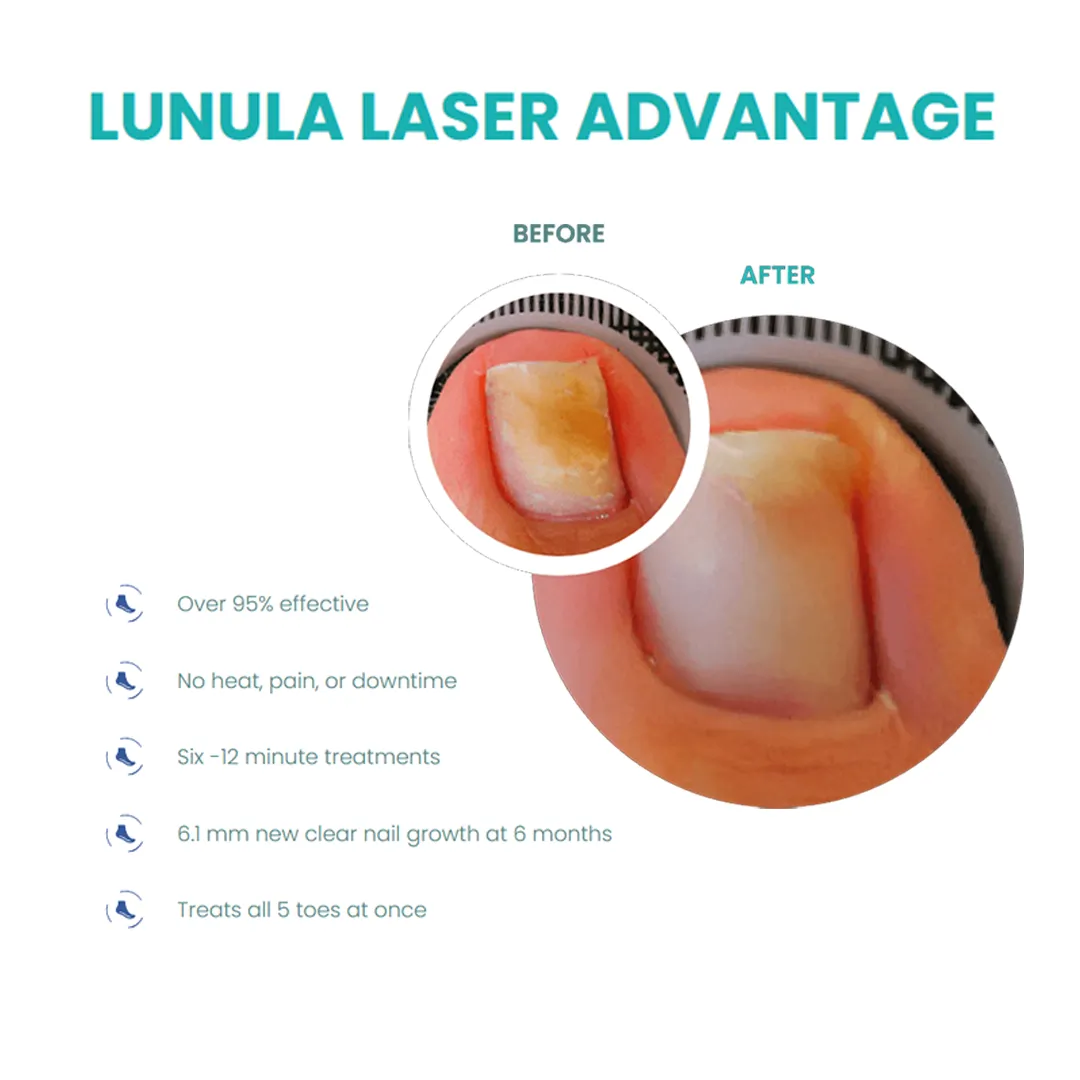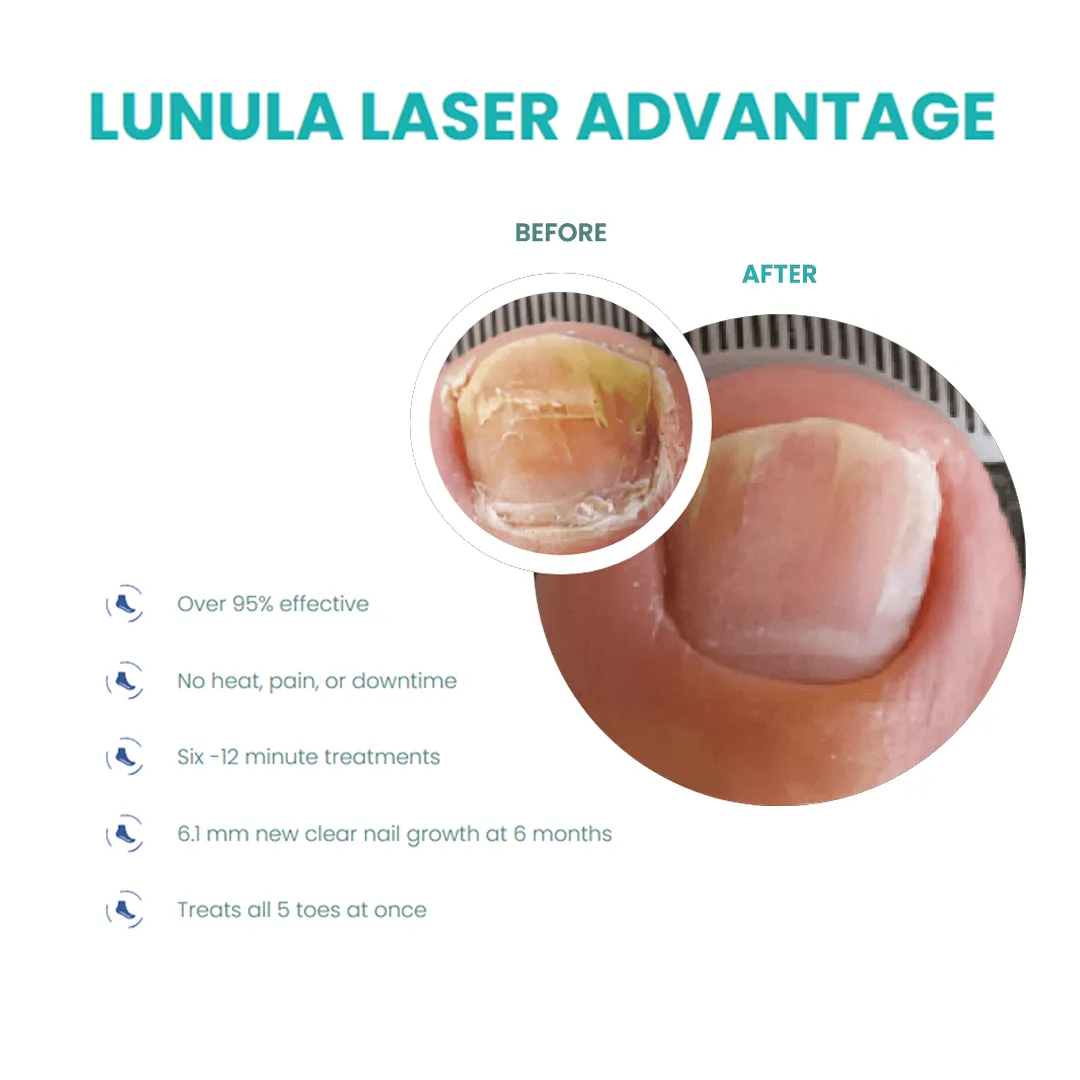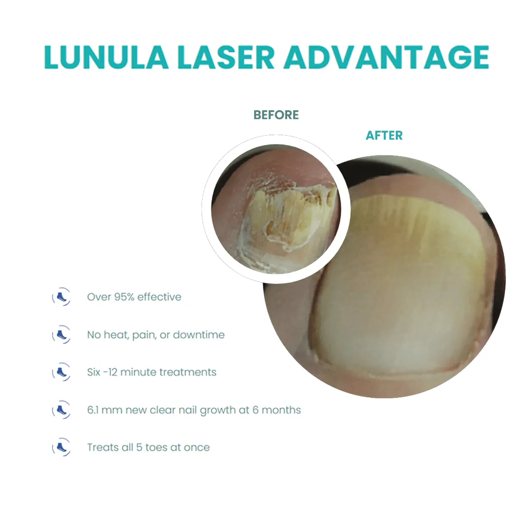 You’ll sit comfortably while the FDA-cleared Lunula Laser treats your affected toenails. Each foot takes just 12 minutes, and there’s no pain, heat, or downtime.